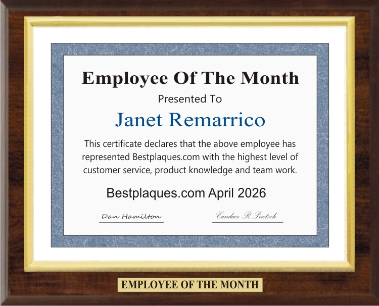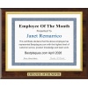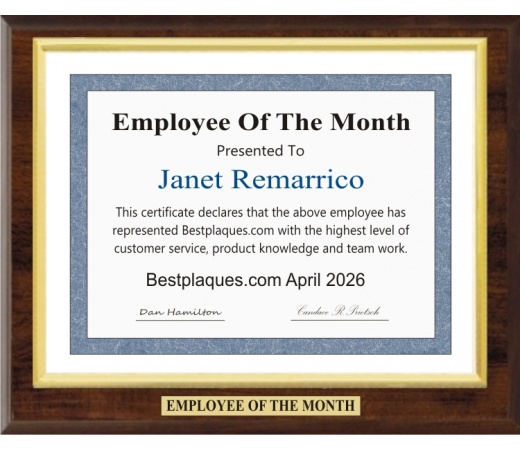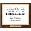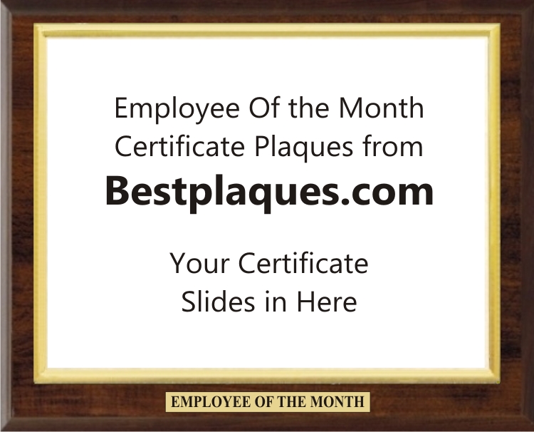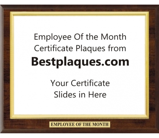 PRODUCT DETAILS Your certificate slides in on the 8.5 sideunder the Gold Frame and Clear Front. Fully Assembled Includes a Gold Nameplatewith the words "EMPLOYEE OF THE MONTH" (Certificate Not Included) Plaque has a slot on the back for hanging your plaque
